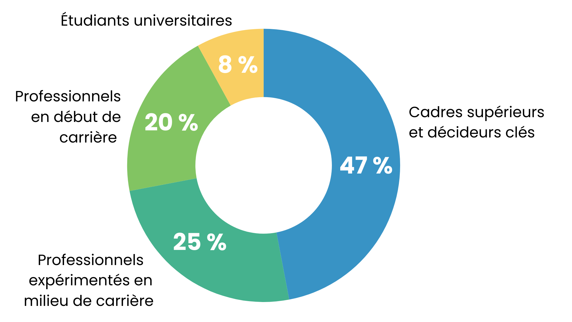 Cadres supérieurs et décideurs clés (47 %) : cadres influents et professionnels expérimentés qui façonnent l’orientation des organisations et des secteurs d’activité.